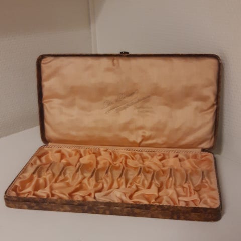 Eldre fiske bestikk sett. I 90 grams plett. Se bilder. 6 kniver og 6 gafler i orginal eske. Selges kr 1000.