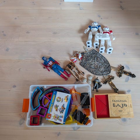 Pakke med flere fine leker og bøker