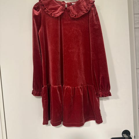 Hust & Claire kjole i størrelse 128 for jente. Kjolen har flerfarget rutemønster og er laget av bomull. Den har lange ermer med elastiske mansjetter og detaljer i form av volanger på brystet.