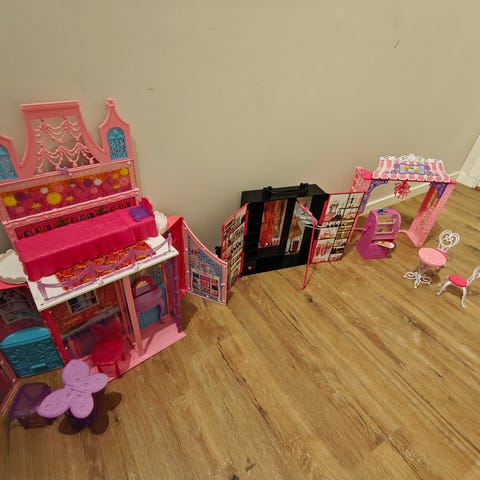 Barbie dukker og tilbehør sett med flere dukker og ulike møbler og utstyr. Inneholder både mannlige og kvinnelige dukker, samt kjøkkenutstyr og møbler i forskjellige farger.