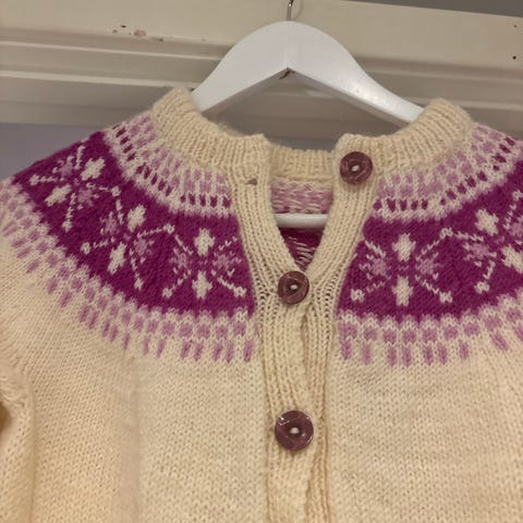Strikkegenser i rød farge med mønster i hvitt og blått. Passer til jente i va størrelse 140. Laget av strikket materiale.