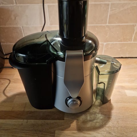 Vi selger denne fine juicepressen kun fordi den aldri blir brukt hos oss. Den er i veldig god stand, ingen feil og ingen deler er ødelagt.