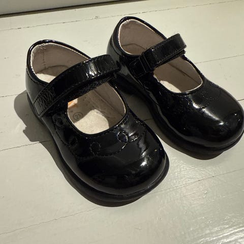Helt nye pensko i lakk med rem i strass. Festes enkelt med borrelås.