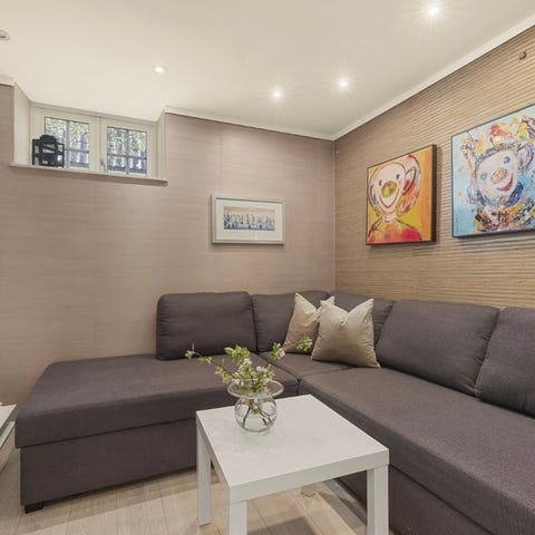 Stor hjørnesofa i tre og stoff. Tykke, gode puter i ryggen. Lite brukt. Mange sitteplasser. Kan enkelt gjøres om til soveplass for to voksne (og eventuelt også ett barn). Rom til sengetøy under sofaen. Passer til oppholdsrom med behov for ekstra sengeplasser.
