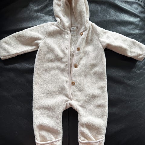 H&M barneheldress i størrelse 62, unisex, laget av polyester. Dressen er brun og har hette, egnet for små barn.