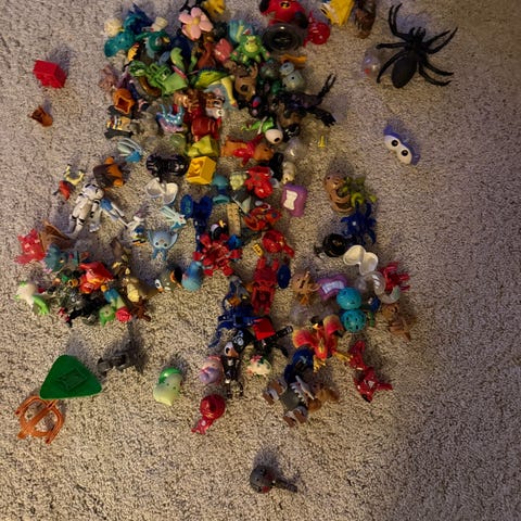 Små keramiske skåler med tegneseriefigurer på innsiden. Skålene har ulike farger og motiver, hver med en diameter på omtrent 5 cm.