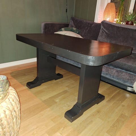Sofa og tøft stuebord på hjul og i metall ø