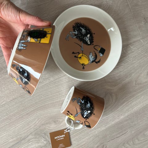 Mummi Stinky service, kopp, asjett og frokostbolle (Nytt og ubrukt)