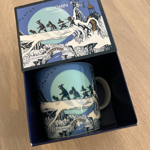 Stinky i farta Mummikopp fra Moomin Arabia er en sjarmerende kopp i vitrinesporselen med den rampete Stinky avbildet sammen med en hund — en historie fanget i hver kopp. Formgitt av Tove Jansson og illustrert av Tove Slotte, gir denne mummikoppen en leken detalj til frokostbordet eller kaffestunden med venner. Robust og lett å rengjøre, passer den like godt til hverdagsdrikker som til samlerhyllen for mummielskeren. En perfekt gave for den som vil ha et smil til kaffen.