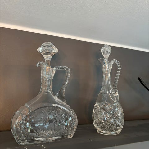 To flotte krystall- karaffler for dessert- sauser selges. Flott til servering av jordbærsausen til riskremen ol. H 21 cm opp til helletuten.