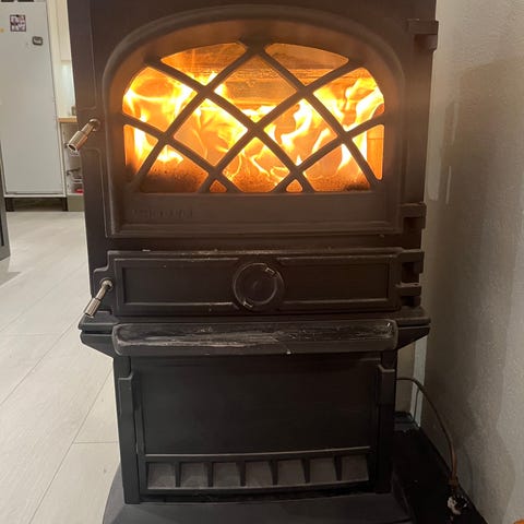 Ovnen fremstår som brukt, men hel og funksjonell. Normal bruksslitasje. Glass, pakninger og luftventiler fungerer som de skal.