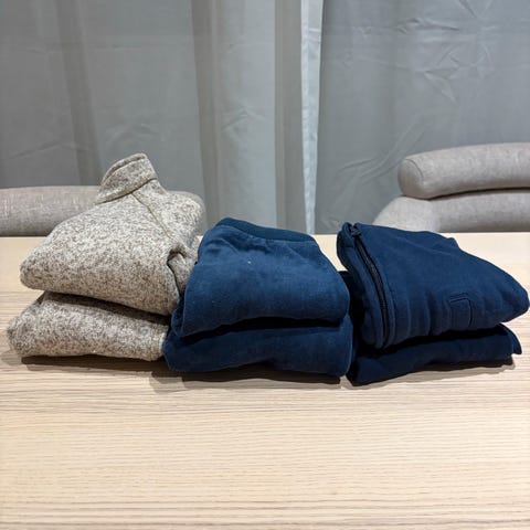 Pakke med 4 behagelige sett i størrelse 74. Inneholder både jakker og gensere med matchende bukser i nøytrale farger.
