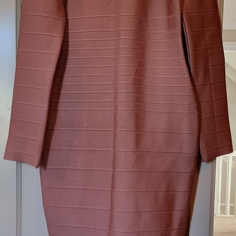 Ettersittende og elastisk partykjole i korall-farge, inspirert av den ikoniske «Herve Leger Carmen Bodycon Coral Dress».