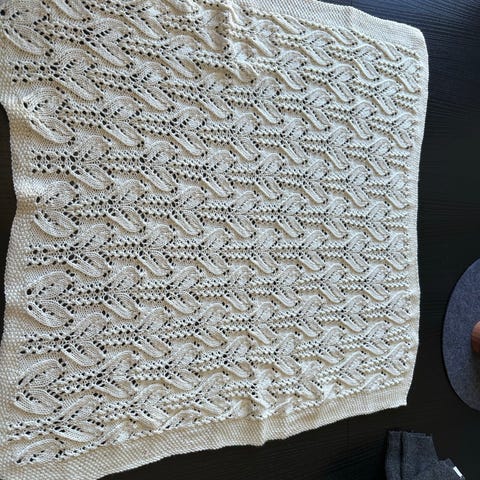 Nytt hjemmestrikket babyteppe strikket i babyull.
