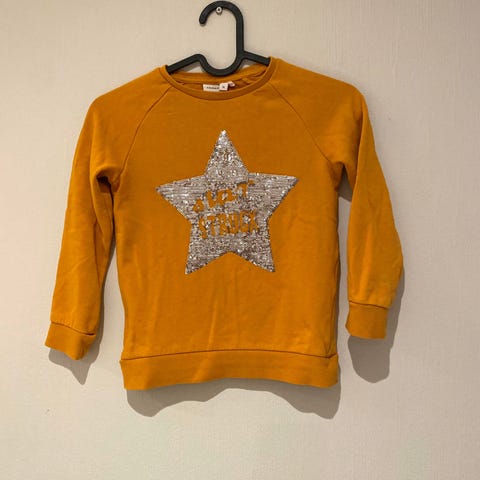 Gul genser fra Name it selges for 100 kr. 60% bomull, 40 %polyester.