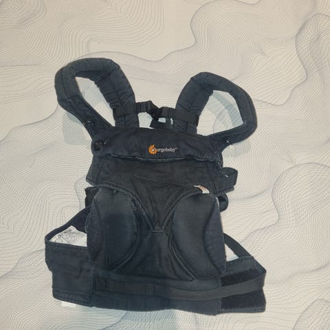 Ergobaby bæresele i grå farge. Designet for å gi komfort og støtte ved bæring av barn. Justerbare stropper for tilpasning.