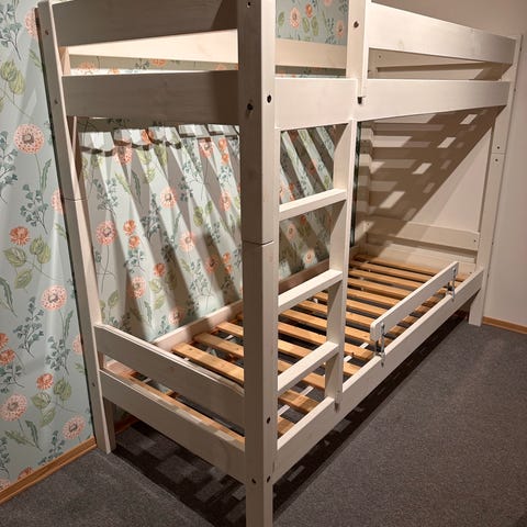 Veldig fin køyeseng fra Grindberg med madrasser overmadrasser og sengebunner - komplett og helt ubetydelig brukt.