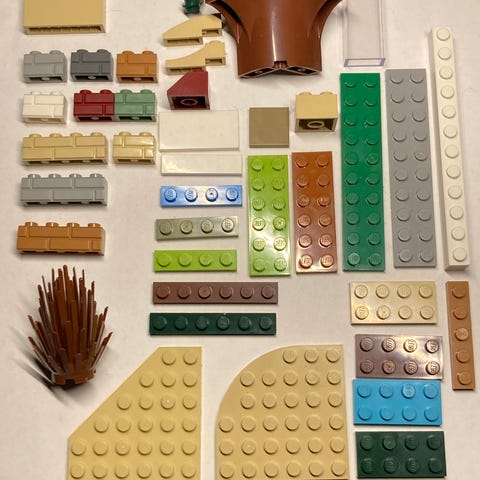 LEGO Friends byggeklosser sett med ulike deler i flere farger, inkludert oransje, grønn, gul, brun og blå. Settet inneholder ulike elementer som blokker, rør og figurer for konstruksjon og lek. Ca 150 gr +hefte. Ikke komplett, noen blomster / blader som mangler.