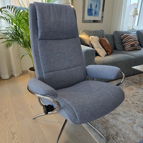 Rød lenestol med fotskammel og metallramme
