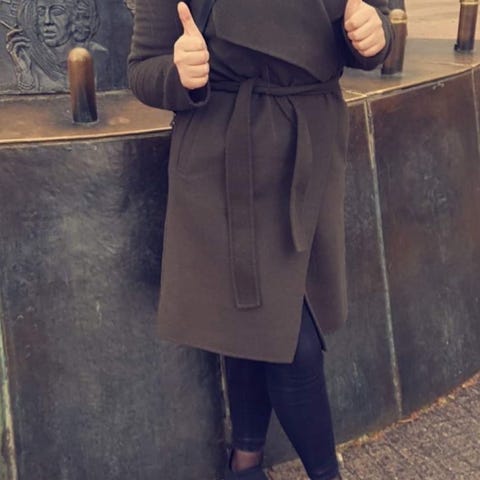Pen og klassisk blå kåpe i god kvalitet. Den har belte i midjen, fin passform og en høy krage med glidelåsdetaljer