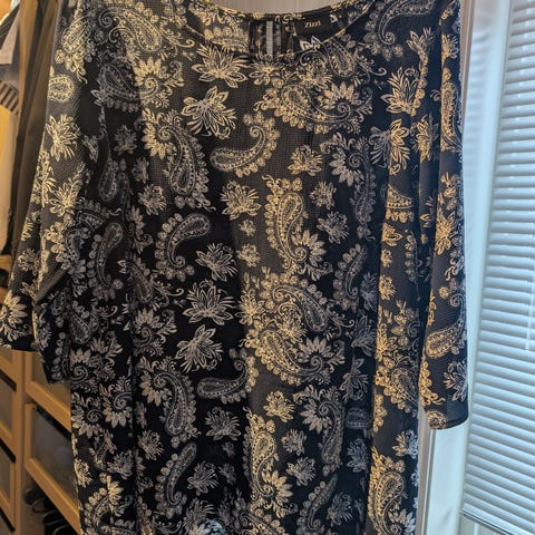 Ståe at det er small, men sybes den er mor som mellom Large og XL. 45% viscose, 55% polyester.
