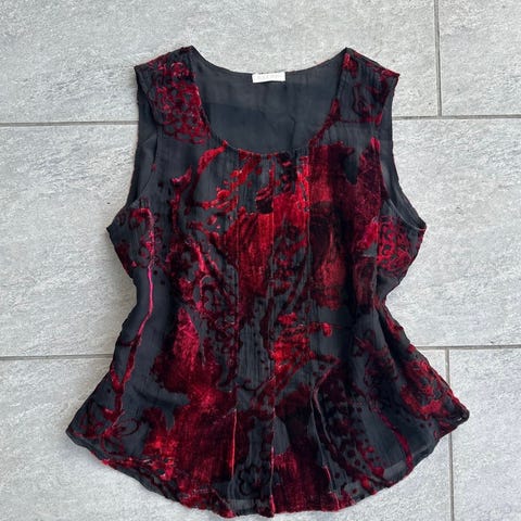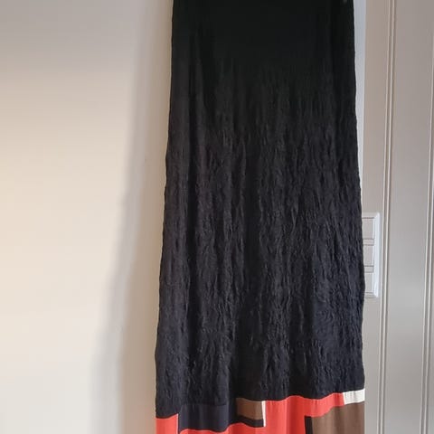 Str 40 som tilsvarer M men kan godt gå på en liten L også. Når den er knytt foran er den 94 cm rundt brystet. Kan også fint brukes åpen.