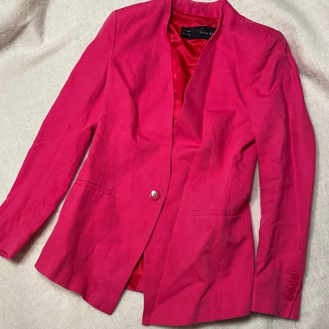 Hugo Boss blazer i rosa farge, laget av polyester. Passer til dame i størrelse 38. Jakken har en knapp foran og fire knapper på ermet. Den har en glatt og ensfarget overflate med en enkel, klassisk design.