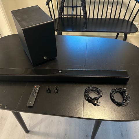 JBL Cinema SB400 lydplanke med trådløs subwoofer. Systemet inkluderer en lydplanke og en separat subwoofer for forbedret lydopplevelse.