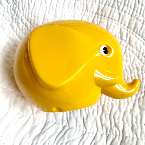 Retro design elefant sparebøsse selges. Finsk design fra 1973. Turkis, mål 9,6 x 11,5 x 7,7 cm. Nøkkel følger med. Har sprukket litt i skøyten og er blitt limt. Fungerer fint for det. Ellers pent brukt.