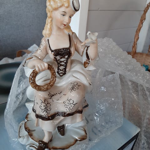 Antikke porselenfigurer. Mann og kone som begge har kurver. Malt i flere farger med detaljerte mønstre. Passer til dekorasjon eller samleobjekt.Har vært litt reperasjon på hanken på kurver. Se bilde. Selges samlet for bud over 800 + frakt.