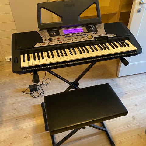 Yamaha PSR-353 keyboard med 61 tangenter og innebygde høyttalere. Tastaturet har LCD-skjerm og flere funksjoner for musikkproduksjon, inkludert ulike lyder og rytmer. Passer til bruk for nybegynnere og viderekomne.