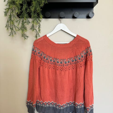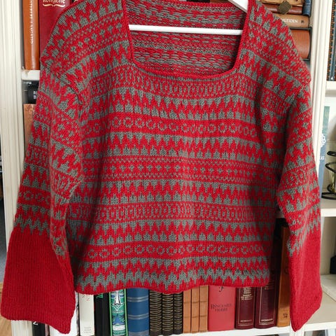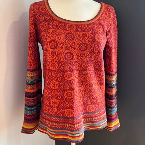 Oleana genser for dame i størrelse S. Genseren er rød med mønster i en ton-i-ton kontrastfarge. Den er laget i ull og har lange ermer og rund, bred hals. Passer til hverdagsbruk og kan kombineres med både bukser og skjørt. Ullmaterialet gir et plagg som egner seg godt i kjøligere vær.