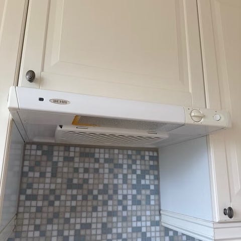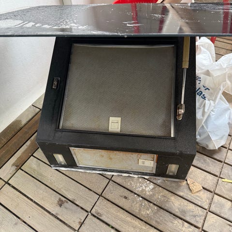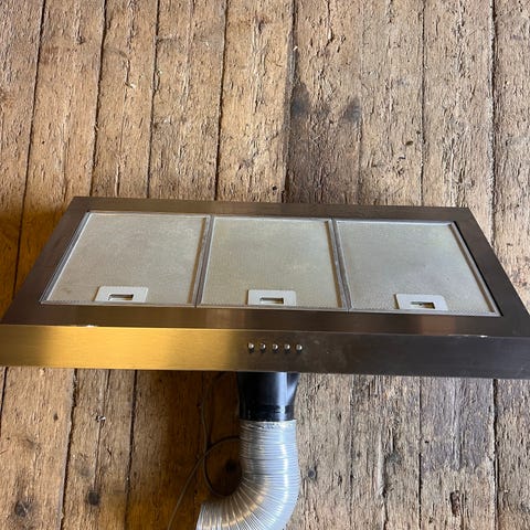 Ventilatorhette i rustfritt stål. Produktet har kontrollknapper på fronten og et metallfilter. Designet for montering over komfyr eller koketopp for ventilasjon i kjøkkenet.
