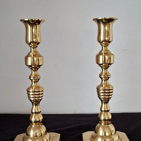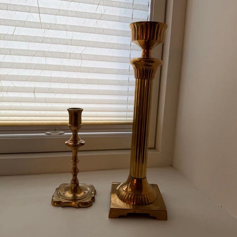 Vintage messing lysestaker 2 stk. En måler 29cm,den andre 26cm. Selges samlet for 300kr