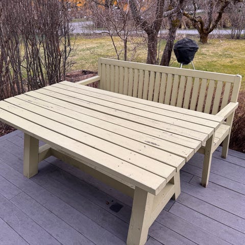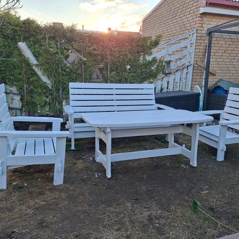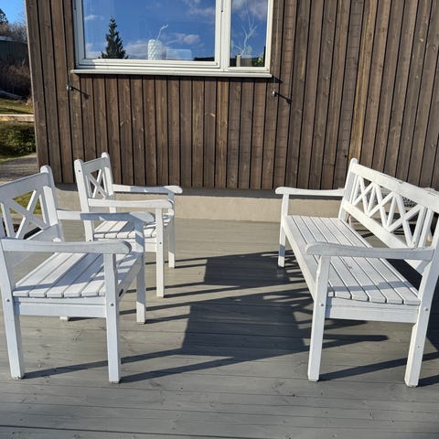 Hillerstorp hagemøbelgruppe i hvitmalt tre med bord, sofa og to stoler. Bord med kryssben, sofa og to stoler med armlener.
