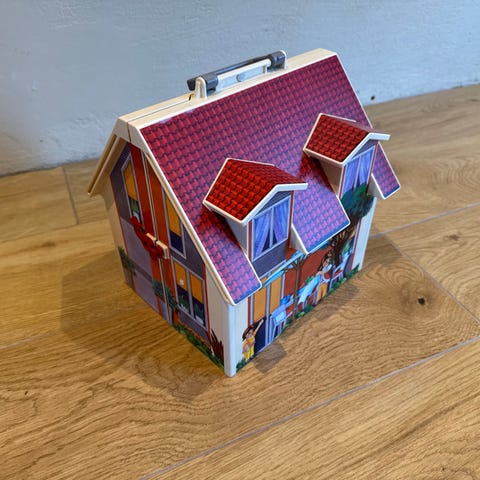 Stort Playmobil dukkehus med flere rom, hvit fasade og rødt tak. Materiale i plast, egnet for barn. Inneholder flere vinduer, dører og balkong, med plass til lek og oppbevaring av tilbehør.