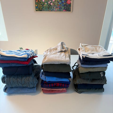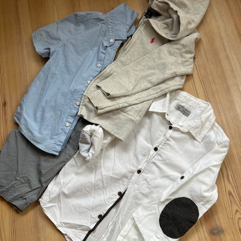 Plaggene er i ca størrelse 5-7 år. Pakken består av en shorts, en t-skjorte og 7 bukser i merker som hm, levis, Zara og Ralph Lauren. Den sorte zarabuksen har fått et hull på kneet og levisbuksen er litt slitt bakpå. Ellers lite bruksmerker!