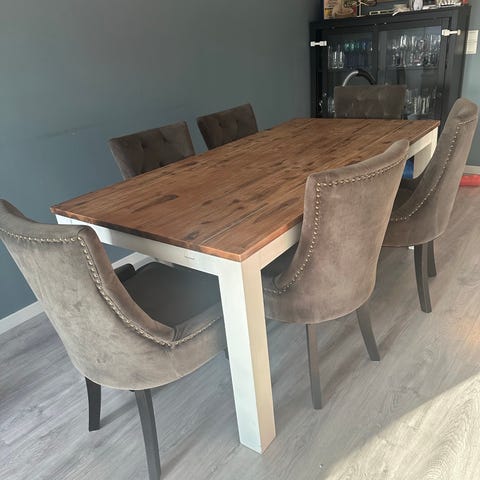 Stolene er redesignet fra gamle skolestoler. Stoffet er i møbel velour mørke brunt. Noen flekker på setene etter at barna har spist, men møbelrens har tatt flekkene før 😊
