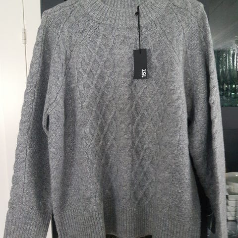 Flott og robust strikket genser i tøff sennep gul melert farge. Stor i størrelse. Vide armer som har en løs strikk kant nede. Rett i modellen.