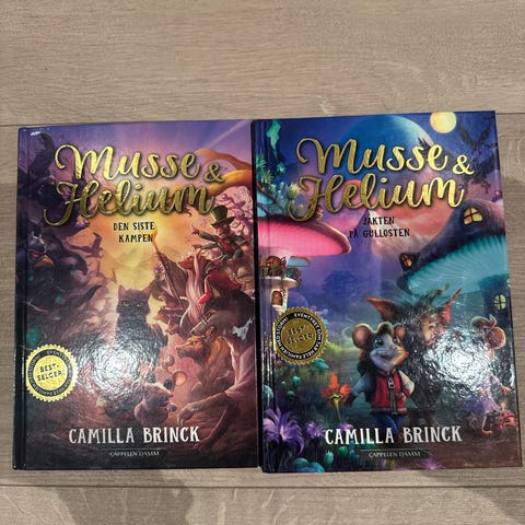 Camilla Brinck Musse & Helium barnebøker, inkludert titler som Eventyret i Lindrizia, Jakten på Cellosten, og Mysteriet med hullet i veggen. Serien inneholder illustrerte historier med fantasifulle karakterer og eventyr, egnet for barn.
