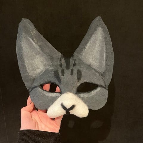 Masken er laget av en jente som har god erfaring med å lage slike. Hun bruker ordentlig utstyr og materialer. På denne er det maling, lim, pels, netting, metalltråder, strikk og stoff på innsiden for å gjøre den komfortabel. Det tar ca. 5 timer å lage en slik maske når man vet hva man gjør.