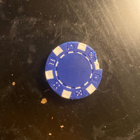 Pokerbrikker sett med terninger og oppbevaringsetui. Settet inkluderer pokerbrikker i flere farger (svart, rød, blå, grønn, hvit) og terninger. Oppbevaringsetuiet i skinn, er svart med hvite sømmer og har plass til brikker og terninger.