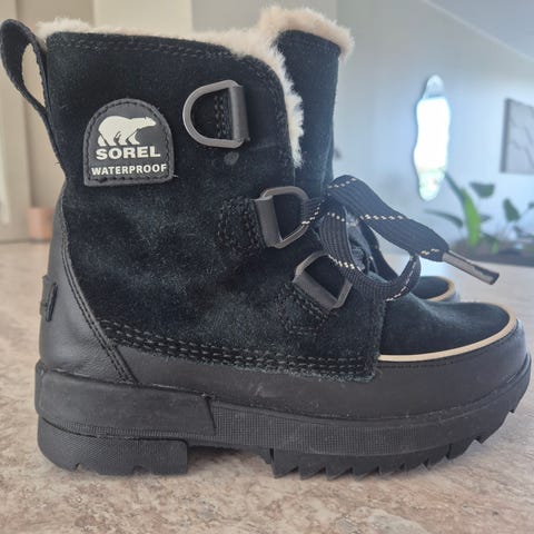 Sorel unisex vintersko i størrelse 37. Den er kanskje litt liten i størrelsen… Støblene har en kombinasjon av materialer med en solid såle og fôr med kunstig pels rundt åpningen for ekstra varme. Semsket skinn som er godt impregnert i gyllen farge. Egnet for bruk i kalde og værforhold. Kostet 1550kr som nye og er brukt kanskje 2 ganger.