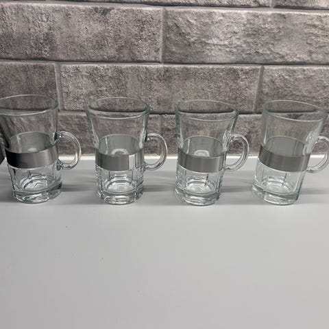 Rosendahl glasskrus med hank i klart glass. Fire stk. i settet, designet for servering av varme og kalde drikker. Tåler daglig bruk og har et enkelt, funksjonelt design.
