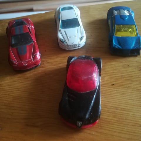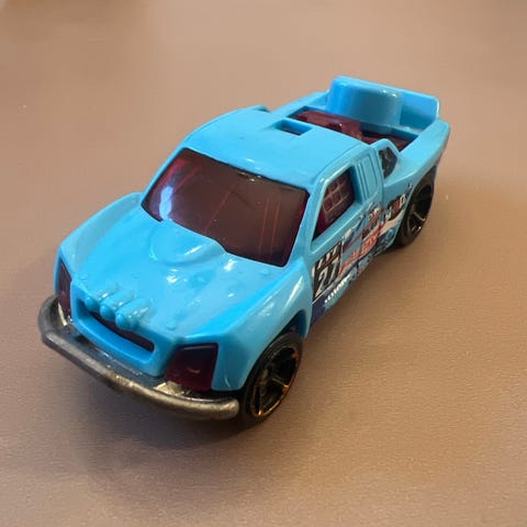Hot Wheels leketøysbil med oransje og lilla farger. Modellen har en gjennomsiktig oransje kropp med metalliske detaljer og lilla hjul. Passer som samlerobjekt eller leke.