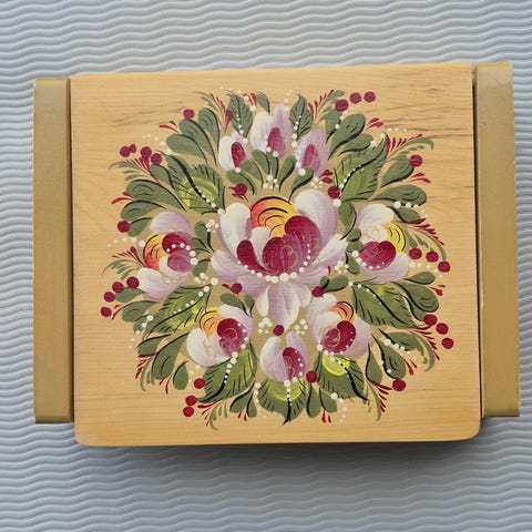 Treskrin med lokk, firkantet form, dekorativt mønster på lokket, laget i flere tresorter. Egnet for oppbevaring av små gjenstander.