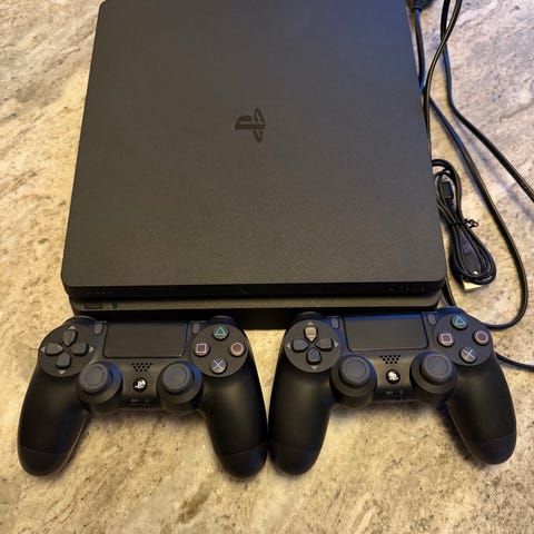 Sony Playstation 4 spillkonsoll med 500 GB lagringskapasitet. Konsollen leveres med trådløs kontroller og har tilkoblingsmuligheter for nettverk og USB-enheter.