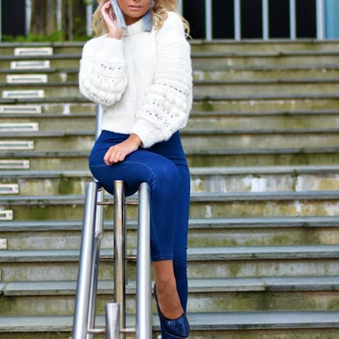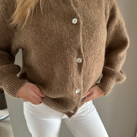 Jakken er strikket i Peer Gynt-garn kombinert med bouclé, noe som gir den et mykt, fluffy og eksklusivt uttrykk. Den er varm, lett og perfekt for både hverdag og koselige kvelder.