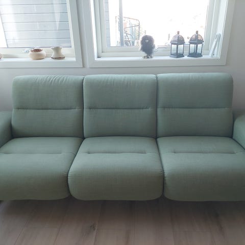 Veldig pent brukt sofa selges. Kvalitetsvelur, med litt gjenskinn. Prøvde å ta litt nærbilde av stoffet. Fargen stemmer ganske godt på bilde.