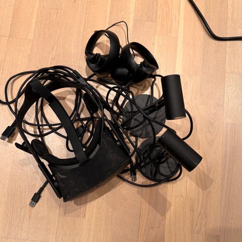 Oculus Rift S VR-headset med tilhørende kontroller. Kjøpt brukt for noen år siden og ble ikke brukt så mye som jeg trodde jeg ville. Alt som jeg fikk med er med.